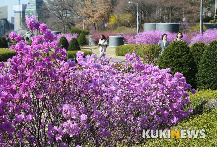 2일 오전 서울 이화여자대학교에서 학생들이 진달래를 보며 봄을 만끽하고 있다.