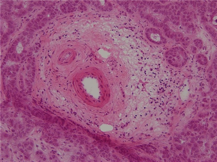 작품설명: 유방암을 동결절편했다. 주위로 몰려드는 암세포들에 둘러싸인 혈관이 마치 절규하는 모습이다.
