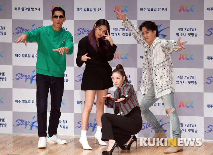 가수 박준형과 유빈, 산다라박, 은지원이 2일 오후 서울 마포구 상암동 JTBC사옥에서 열린 '스테이지K' 제작발표회에 참석해 포토타임을 갖고 있다.
