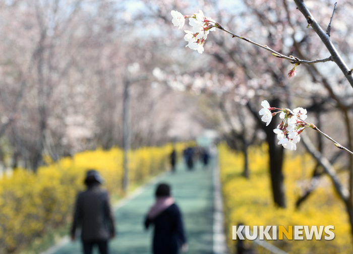 '양재천 힐링 벚꽃축제'가 열린 4일 오전 서울 강남구 양재천 일대에서 시민들이 벚꽃길을 걷고 있다.