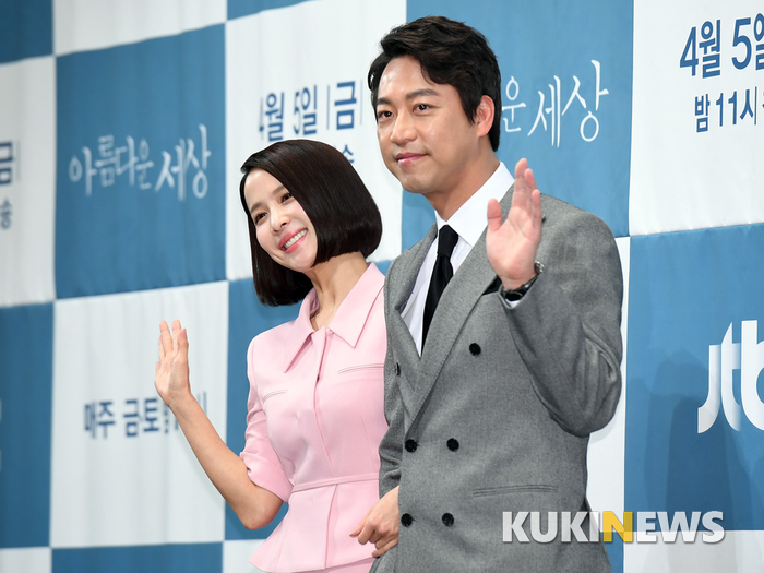 배우 조여정과 오만석이 4일 오후 서울 언주로 임피리얼팰리스에서 열린 tvN 새 금토드라마 ‘아름다운 세상’ 제작발표회에 참석해 포즈를 취하고 있다.
