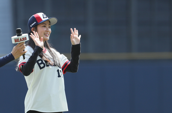 배우 김혜윤이 7일 오후 서울 송파구 잠실야구장에서 열린 2019 프로야구 두산과 NC의 경기에서 시구 전 관중에게 인사하고 있다.