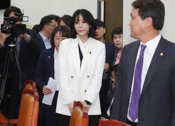 배우 고(故) 장자연 씨를 둘러싼 성접대 강요 사건에 대한 증언을 이어가고 있는 동료 배우 윤지오 씨(흰색 상의)가 8일 오전 국회 본청에서 문화체육관광위원회 소속의원 등과 간담회를 하기위해 간담회장으로 들어오고 있다.