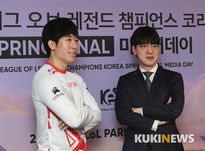 그리핀 김대호 감독과 김정균 감독이 9일 오후 서울 종로구 그랑서울 롤파크에서 열린 '2019 리그 오브 레전드 챔피언스 코리아 스프링 파이널 미디어데이'에서 포즈를 취하고 있다.