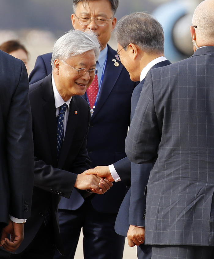 문재인 대통령이 10일(현지시간) 미국 워싱턴 앤드류스 공군기지에 도착, 조윤제 주미 한국대사와 인사하고 있다.