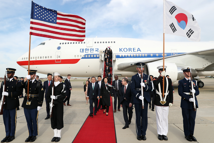문재인 대통령과 김정숙 여사가 10일(현지시간) 미국 워싱턴 앤드류스 공군기지에 도착했다.