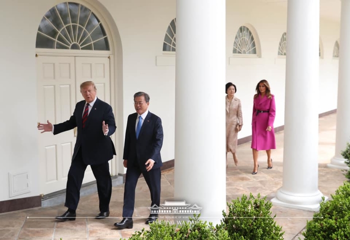 문재인 대통령과 도널드 트럼프 미국 대통령이 11일 오후(현지시간) 워싱턴 백악관에서 회담장소로 이동하고 있다.