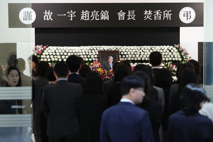 12일 오후 서울 대한항공 서소문 사옥에 마련된 고 조양호 한진그룹 회장의 빈소에서 직원들이 조문을 하고 있다.