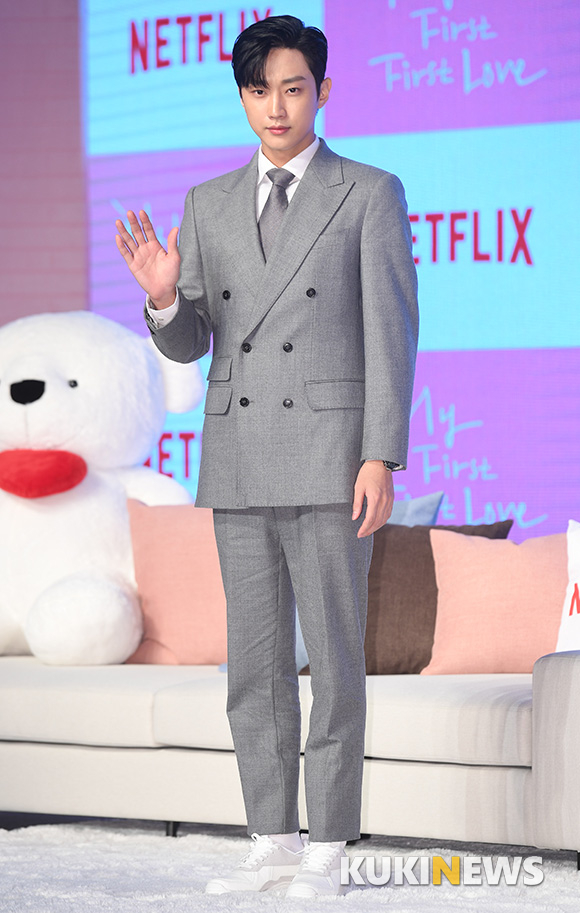 배우 진영이 12일 오전 서울 여의도 콘래드 서울에서 열린 넷플릭스 '첫사랑은 처음이라서' 제작발표회에 참석해 포즈를 취하고 있다.