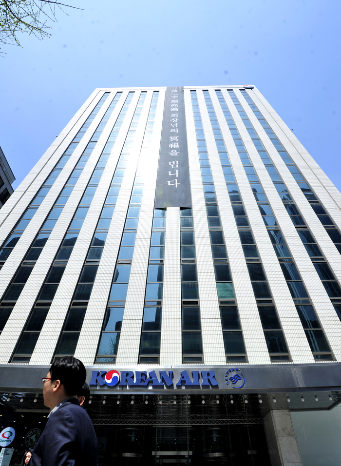 12일 서울 중구 대한항공 서소문사옥에 故 조양호 한진그룹 회장을 추모하는 현수막이 걸려있다.