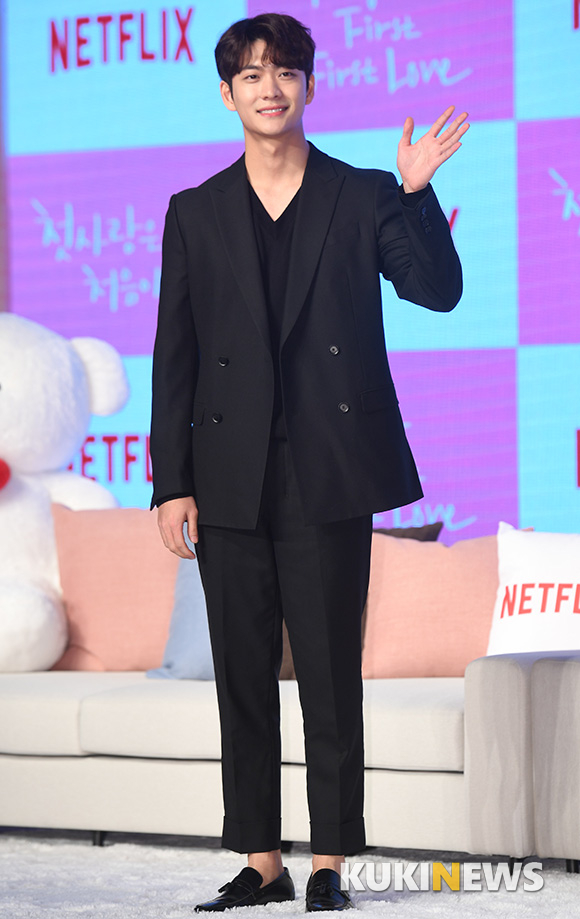 배우 강태오가 12일 오전 서울 여의도 콘래드 서울에서 열린 넷플릭스 '첫사랑은 처음이라서' 제작발표회에 참석해 포즈를 취하고 있다.