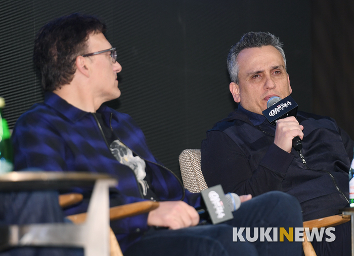 안소리 루소와 조 루소 감독이 15일 오전 서울 광화문 포시즌스호텔에서 열린 영화 '어벤져스: 엔드게임' 아시아 프레스 컨퍼런스에서 취재진의 질문에 답하고 있다.
