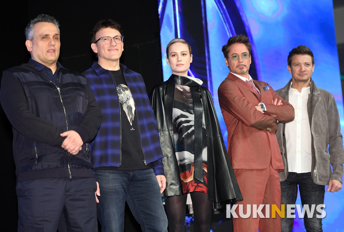 안소니 루소와 조 루소 감독, 배우 브리 라슨, 로버트 다우니 주니어, 제레미 레너가 15일 오전 서울 광화문 포시즌스호텔에서 열린 영화 '어벤져스: 엔드게임' 아시아 프레스 컨퍼런스에서 포즈를 취하고 있다.