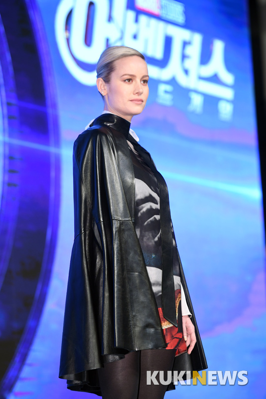 배우 브리 라슨이 15일 오전 서울 광화문 포시즌스호텔에서 열린 영화 '어벤져스: 엔드게임' 아시아 프레스 컨퍼런스에서 포즈를 취하고 있다.