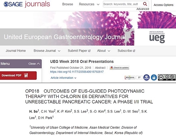 논란이 한창이던 2018년 10월 20일부터 24일, 오스트리아 비엔나에서는 유럽 소화기내과 의사들의 축제인 ‘UEG(United European Gastroenterology) week 2018’이 열렸다. 그리고 행사 둘째 날인 22일 오전, 18번째 구두발표는 서울아산병원 박도현 교수의 ‘2세대 광과민제를 활용한 광역학치료 임상2상 시험결과’였다.