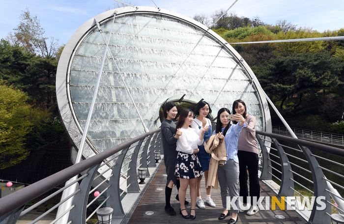 16일 오후 서울 서초구 예술의전당 인근 아쿠아아트 육교 위에서 구청 직원들이 워터스크린을 배경으로 포즈를 취하고 있다.