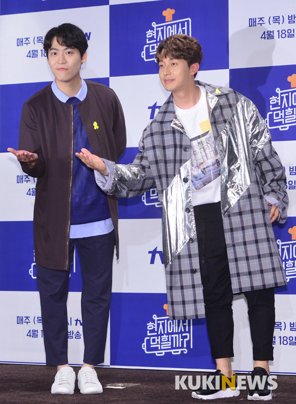 개그맨 허경환와 가수 존박이 16일 오후 서울 영등포구 여의도동 여의도 켄싱턴호텔에서 열린 tvN 예능프로그램 ‘현지에서 먹힐까? 미국편’ 제작발표회에 참석해 포즈를 취하고 있다.