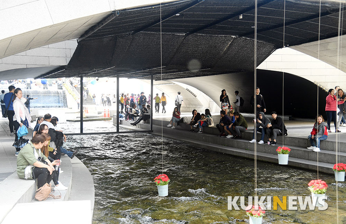 서울 낮 기온이 28도까지 오르는 등 초여름 날씨를 보인 22일 오후 청계천을 찾은 시민과 관광객들이 다리 밑에서 더위를 식히고 있다.