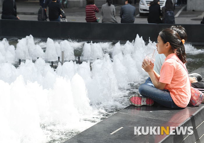 서울 낮 기온이 28도까지 오르는 등 초여름 날씨를 보인 22일 오후 청계천을 찾은 한 어린이가 더위를 식히고 있다.
