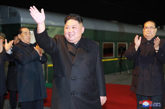 김정은 북한 국무위원장이 북·러정상회담을 위해 24일 새벽 블라디보스토크행 열차에 탑승하기 전 전송 인파를 향해 손을 흔들고 있다.