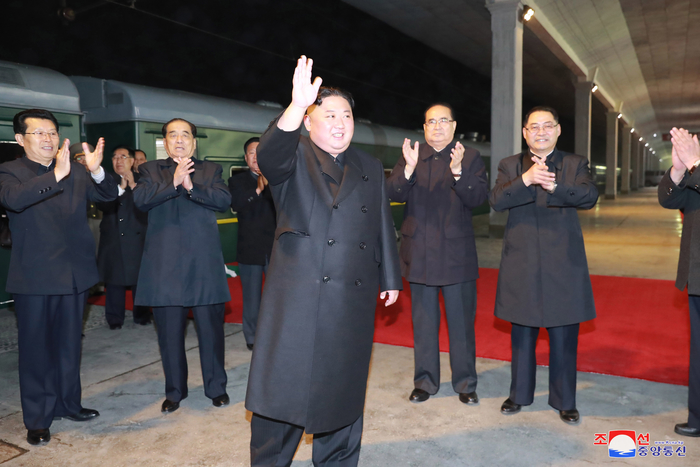 김정은 북한 국무위원장이 북·러정상회담을 위해 24일 새벽 블라디보스토크행 열차에 탑승하기 전 전송 인파를 향해 손을 흔들고 있다.