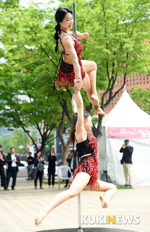 24일 오후 서울광장에서 열린 '문화가 흐르는 서울광장' 사전공연 행사에서 조성아폴아트팀이 멋진 무대를 선보이고 있다.