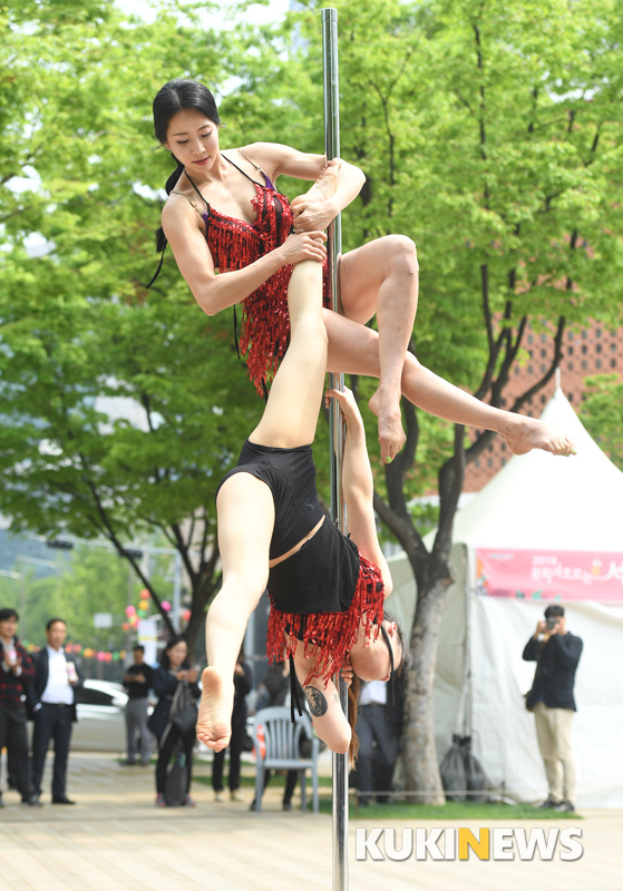 24일 오후 서울광장에서 열린 '문화가 흐르는 서울광장' 사전공연 행사에서 조성아폴아트팀이 멋진 무대를 선보이고 있다.