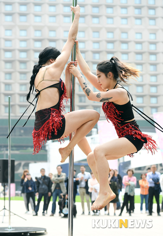 24일 오후 서울광장에서 열린 '문화가 흐르는 서울광장' 사전공연 행사에서 조성아폴아트팀이 멋진 무대를 선보이고 있다.