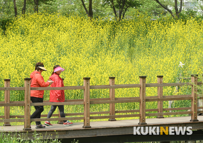 24일 오후 인천 부평구 굴포누리 기후변화 생태체험존에서 시민들이 활짝 핀 유채꽃을 감상하고 있다.