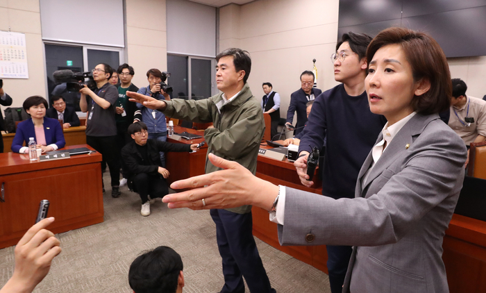 국회 사법개혁특위 이상민위원장과 더불어민주당 소속 위원들이 26일 새벽 자유한국당 의원들의 봉쇄를 따돌리고 법사위 회의실에 진입해 사법개혁특위가 개의하자 후에 들어온 자유한국당 나경원 원내대표(오른쪽)와 의원들이 "우리당 의원들은 회의 통지를 받은 적 없다"며 원천무효라고 항의하고 있다.