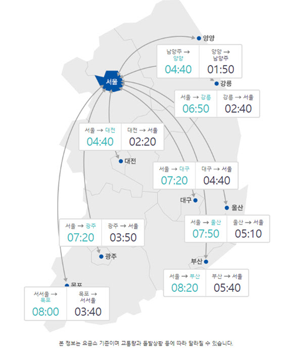 오전 11시 승용차로 서울요금소를 출발해 전국 주요 도시까지 도착하는 데 걸리는 시간은 부산 7시간40분, 목포 7시간30분, 광주 6시간50분, 울산 7시간10분, 대구 6시간40분, 강릉 6시간10분, 대전 4시간20분이다.