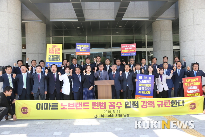 전북도의회는 21일 도의회 광장에서 전주지역에 영업 예고된 이마트 노브랜드 가맹점 2곳의 개점 철회를 촉구하는 ‘이마트 노브랜드 가맹점 개설 저지 결의대회’를 개최했다.