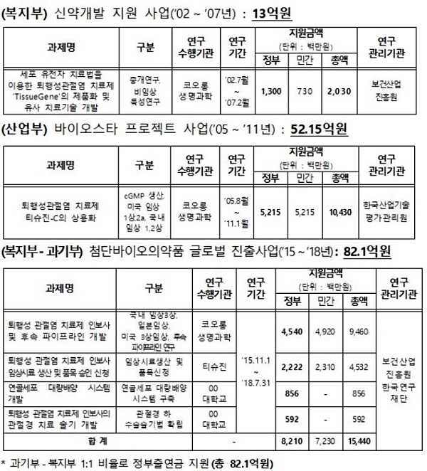 세부적으로 2002년 복지부에서 ‘신약개발 지원사업’, 2005년 산업부에서 ‘바이오스타 프로젝트 사업’을 통해 관련 연구과제를 선정해 코오롱생명과학에 사업별로 각 13억원, 52억1500만원의 국가 R&D 자금을 지원했다. 또 가장 최근인 2015년 복지부-과기부 공동으로 ‘첨단바이오의약품 글로벌 진출사업’을 통해 82억1000만원의 국가 R&D 자금을 지원했다.