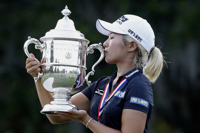 이정은이 2일(현지시간) 미국 사우스캐롤라이나주 찰스턴의 컨트리클럽 오브 찰스턴에서 열린 제74회 US여자오픈에서 우승한 뒤 트로피를 들고 포즈를 취하고 있다.