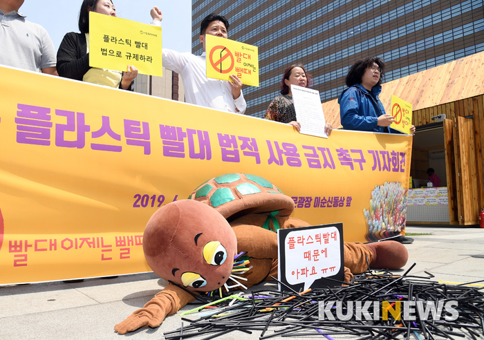 서울환경연합 회원들이 4일 서울 광화문광장에서 '1회용 플라스틱 빨대 사용 금지 촉구 기자회견'을 열고 코에 빨대가 꽂힌 바다거북이의 호소 퍼포먼스를 벌이고 있다.