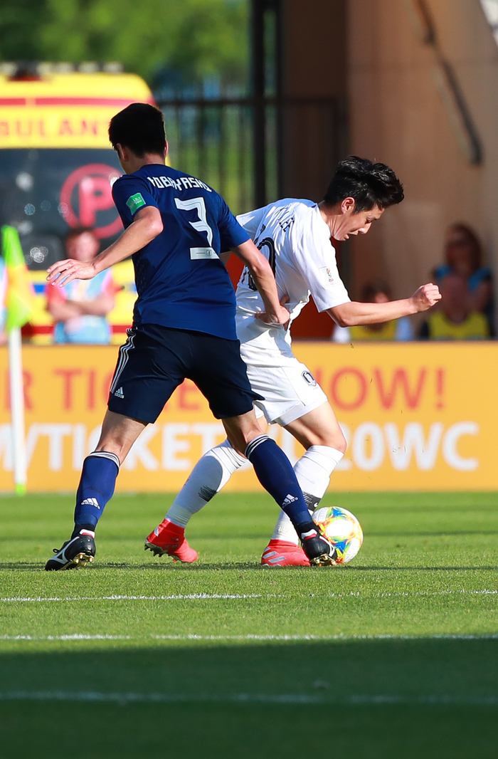 U-20 한국 대표팀 이강인이 4일(현지시간) 폴란드 루블린 경기장에서 열린 2019 국제축구연맹(FIFA) 20세 이하(U-20) 월드컵 16강 일본전에서 슛을 하고 있다.