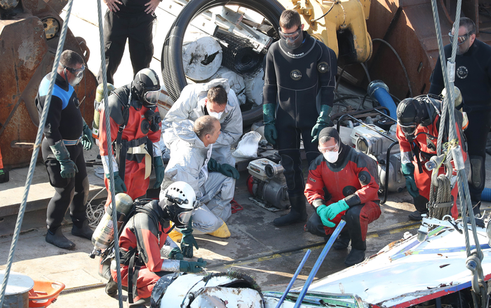11일(현지시간) 헝가리 부다페스트 다뉴브강 머르기트 다리 아래 허블레아니호 인양현장에서 헝가리 대원이 희생자 수습을 준비하고 있다.