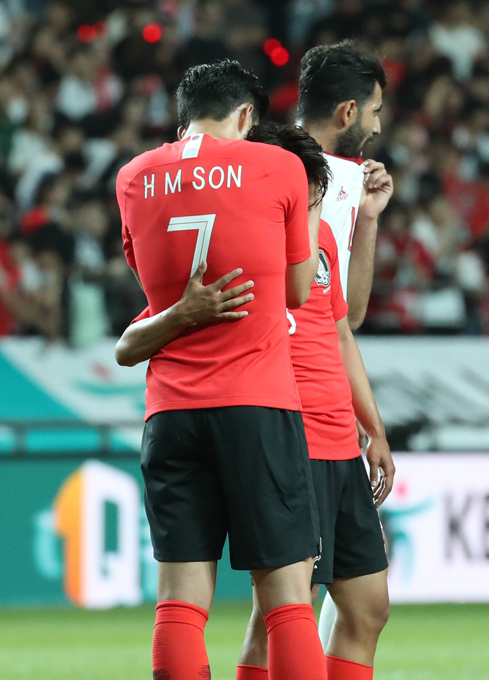 축구 대표팀이 11일 오후 서울월드컵경기장에서 열린 이란과의 평가전에서 1-1로 비겼다. 경기 후 손흥민이 이승우를 격려하고 있다.