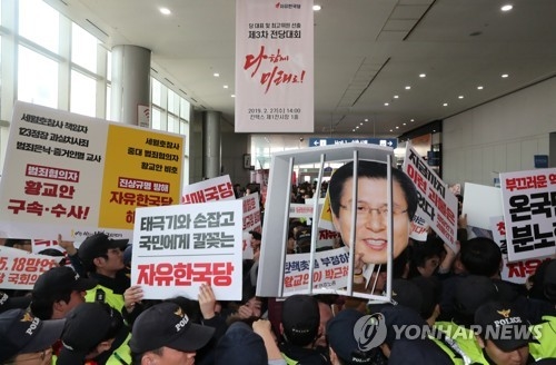 5·18시국회의와 민주노총 등 진보 사회단체는 지난 2월27일 경기 고양시 킨텍스 자유한국당 전당대회장 앞에서 기습 시위를 벌였다. 이들은 5·18 망언 논란을 일으킨 의원 제명을 촉구하다 전당대회 개최 시간이 다가오자 경찰력에 의해 전시장 밖으로 밀려났다.