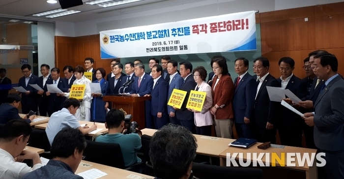 전북도의회는 17일 전북도의회 브리핑룸에서 기자회견을 갖고 “최근 자유한국당 최교일 의원등이 한국농수산대학 설치법 일부 개정을 발의했다”며 “이는 명백히 국가균형발전 측면에서 이전한 한국농수산대학의 근간을 흔드는 일”이라고 주장했다.