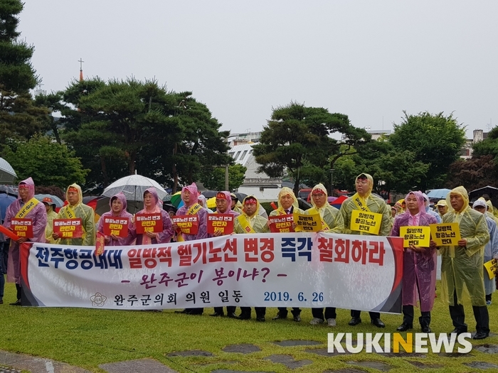 대책위는 이날 얼음깨기 외에도 스티로폼으로 만든 가상헬기를 부수는 퍼포먼스를 진행하는 등 백지화 관철 뜻을 분명히 했다. 이들은 △완주군 상공 헬기노선 철회 △완주군민 기망한 전주시장 사과 △완주 상공 헬기노선 이유와 폭력적 일방행정 주무부처 관련자 즉각 처벌 등 3개항을 강력히 요구하는 문건을 전주시에 전달했다.