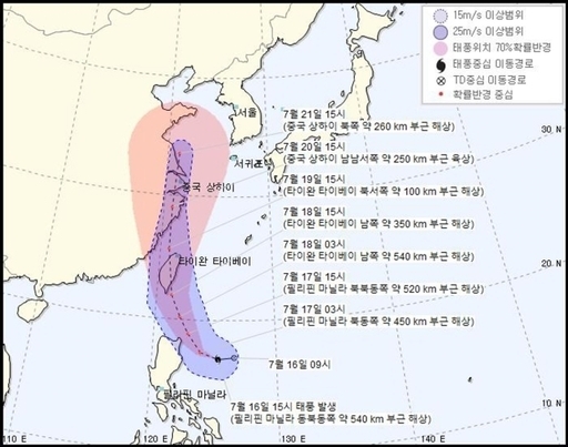 다나스는 19일 오전 3시쯤 중국 상하이 남남동쪽 약 400km 부근 해상을 지나, 20일 오전 3시께 제주 서북서쪽 약 40km 부근 해상까지 접근할 전망이다. 이후 주말인 21일 오전 3시쯤 독도 동쪽 약 220㎞ 부근 해상을 지나며 세력이 약해진 상태로 일본으로 향할 것으로 예상된다.
