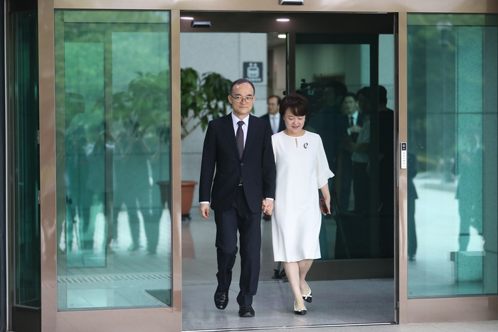 문무일 검찰총장이 24일 서울 서초구 대검찰청에서 퇴임식을 마친 뒤 부인과 함께 청사를 떠나고 있다.
