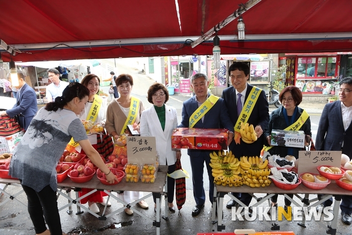 이어 미리 구입한 온누리상품권으로 과일과 생선 등 추석 제수용품 구매와 ‘전통시장을 이용합시다’라는 어깨띠를 두르고 캠페인을 전개했다.