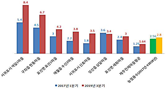 김 의원에 따르면, 올 3분기 92개 마을 중에서 상수도가 작년 농업용수 평균 함유량 2.8㎎/ℓ보다 더 많은 질산성 질소를 함유한 마을은 모두 13곳으로 나타났다. 이들 마을 가운데 서귀포시 색달1마을은 질산성 질소 함유량이 허용한계치 10㎎/ℓ에 성큼 다가선 8.4㎎/ℓ를 기록했다. 이는 2017년 1분기 보다 36% 늘어난 것.
