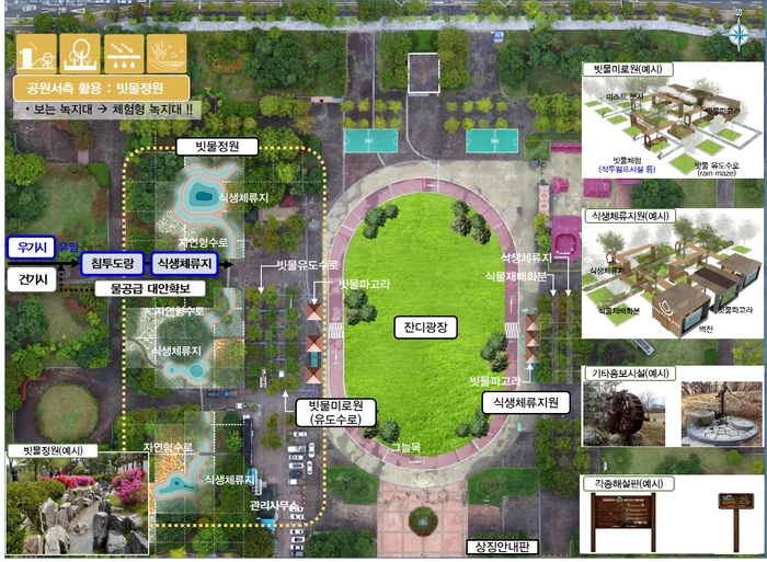 또한, 물길찾기 빗물미로원, 미세먼지 저감용 빗물분사 미스트, 빗물파고라 등을 설치하고 기존의 콘크리트 광장(4,240㎡)을 투수성 잔디광장으로 개선, 녹지율 증가 및 시민 휴식공간 확충을 꾀했다.