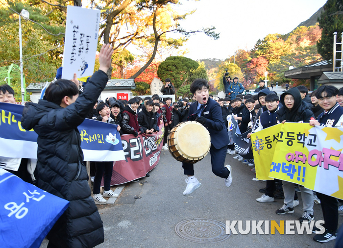 2020학년도 대학수학능력시험일인 14일 오전 서울 종로구 경복고등학교에서 재학생과 선생님이 수험생을 격려하고 있다.