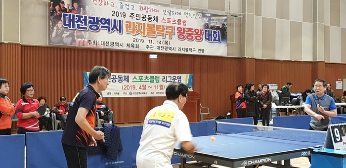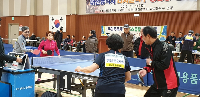 14일 오전 10시 대전 한밭체육관. 대전시 라지볼탁구 왕중왕 대회에 참가한 100여명의 남녀 어르신 선수들이 파이팅을 외치며 경기를 벌이고 있었다.
