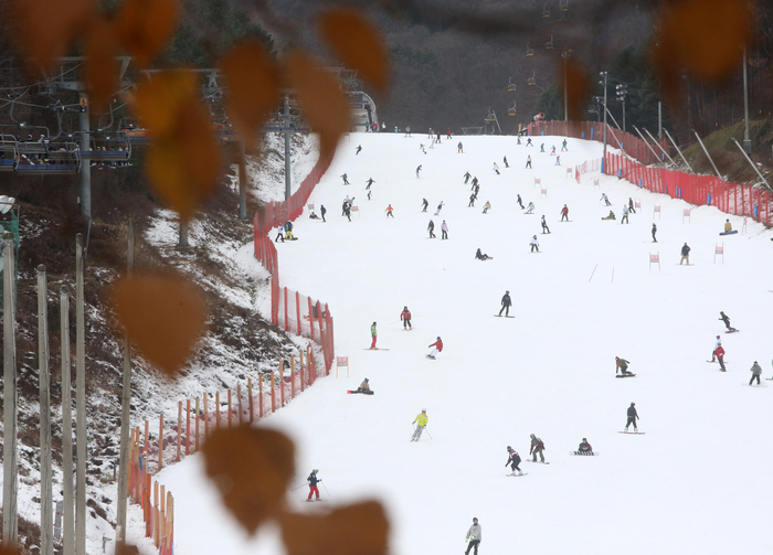 주요 스키장 개장 후 첫 주말을 맞은 17일 오전 평창군 휘닉스평창 스노우파크에서 스키어와 스노보더들이 슬로프를 질주하고 있다.