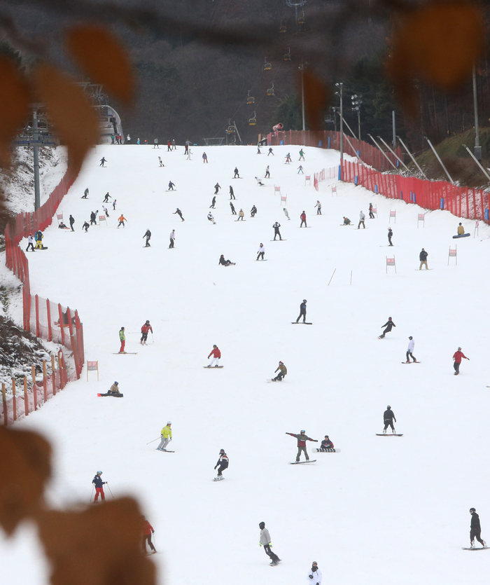 주요 스키장 개장 후 첫 주말을 맞은 17일 오전 평창군 휘닉스평창 스노우파크에서 스키어와 스노보더들이 슬로프를 질주하고 있다.
